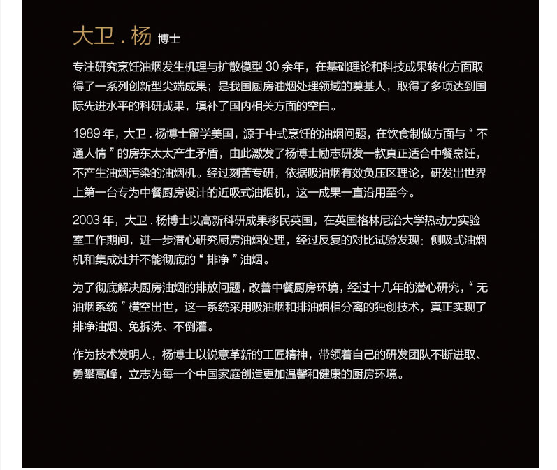 作为技术发明家,杨博士带队他自己的研发团队不停发扬光大创新精神上,勇敢攀登顶峰,并为每个中国家庭创造一个更暖和,更健康的厨房环境的工艺精神上。